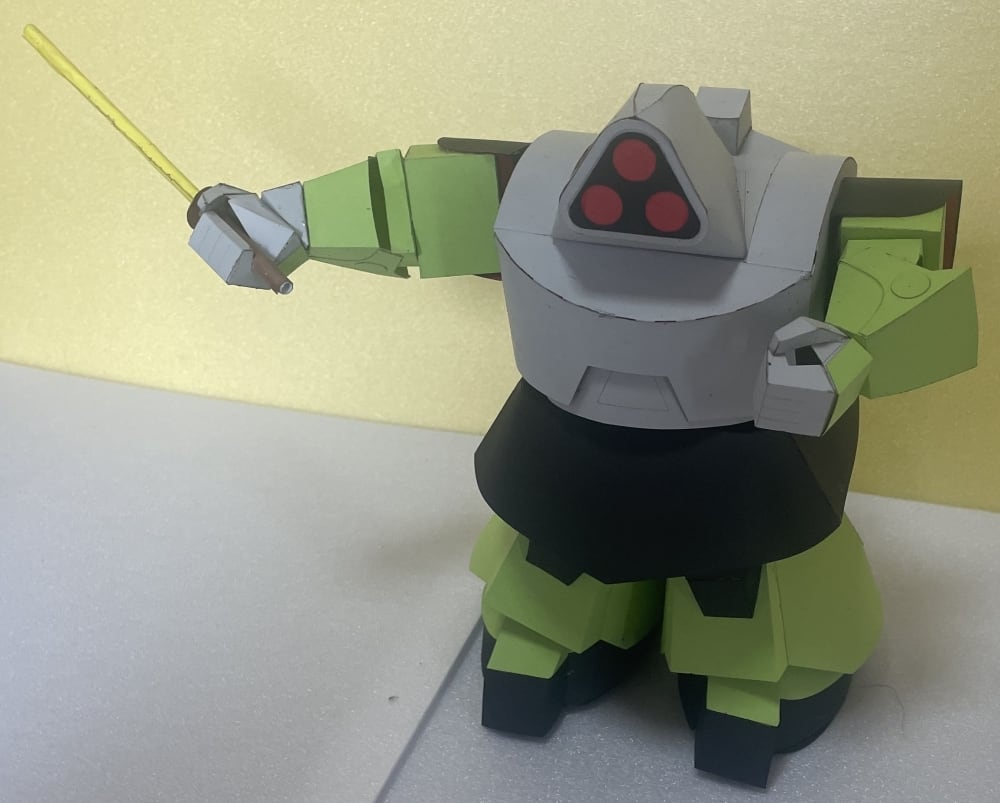 This 3-channel RC robot features a styrene frame covered with a paper craft exterior, which can be downloaded for free from our website. It replicates tank-like actions, with the body rotating 360 degrees instead of a turret, swinging a sword dynamically. The head is attached with a magnet, allowing easy removal for head-to-head battles where players try to knock each other's heads off with the sword.